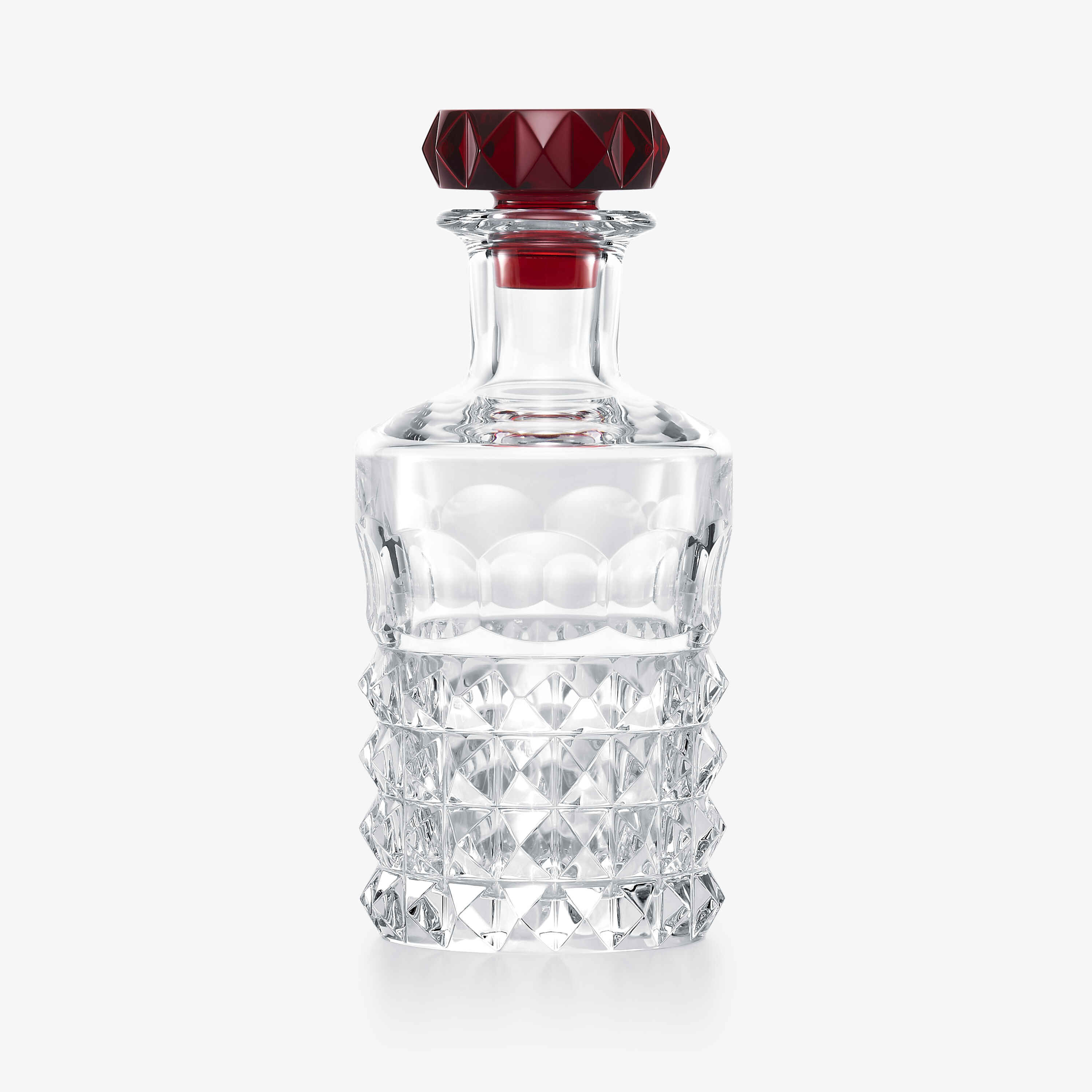 Baccarat unveils a collection of its iconic decanters crowned with a red crystal stopper, the Maison's signature color. Symbolizing fire, love, and passion, red is an energizing hue that stimulates the senses. With its deep intensity, Baccarat red is the result of fusing clear crystal with 24-carat gold powder. Like Baccarat chandeliers adorned with a distinctive red crystal tassel, these Harcourt, Harmonie, and Louxor wine or spirit decanters embody refined craftsmanship and add a festive, joyful touch of color to any occasion. * Cut with geometric motifs inspired by the pyramids of ancient Egypt, the Louxor whisky decanter comes alive with amber reflections. A true barware gem, it embodies Baccarat's fusion of elegance and boldness. Topped by an octagonal stopper, this piece designed by Thomas Bastide invites whisky lovers on a unique sensory voyage.