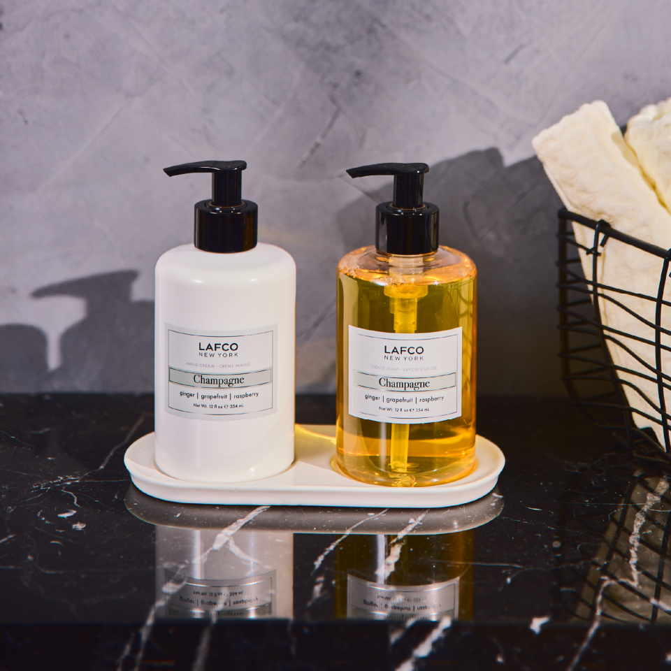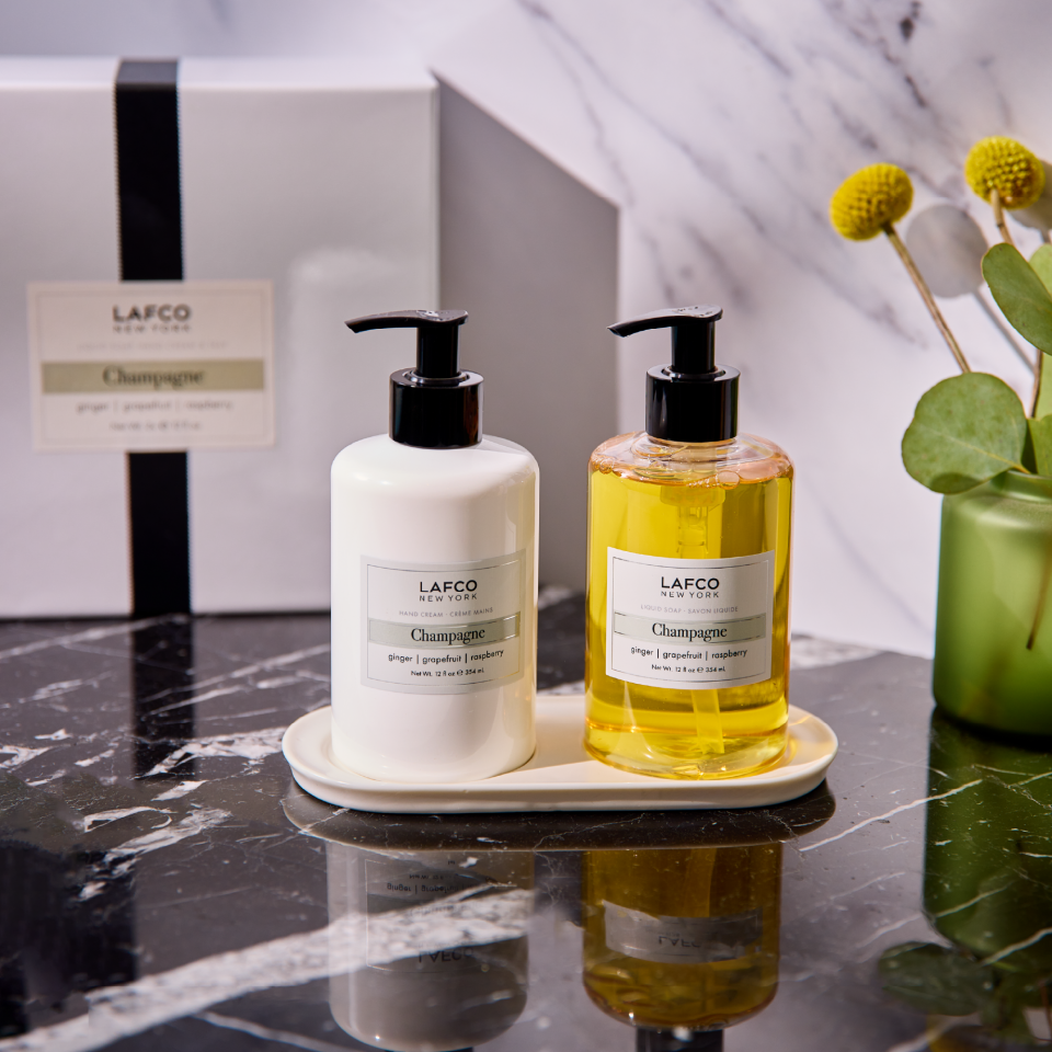Perfect for the kitchen or bath. Our deluxe hand care set includes a liquid soap, hand cream, and ceramic tray that adds a simple, spa-like touch to any space. Fresh orange and mandarin zest sparkle with a twist of grapefruit and ginger. Essences of rose and neroli, woven with verbena, make the scent effervescent and bright.