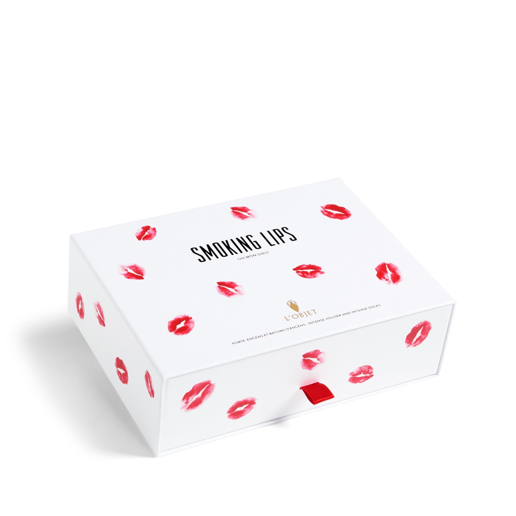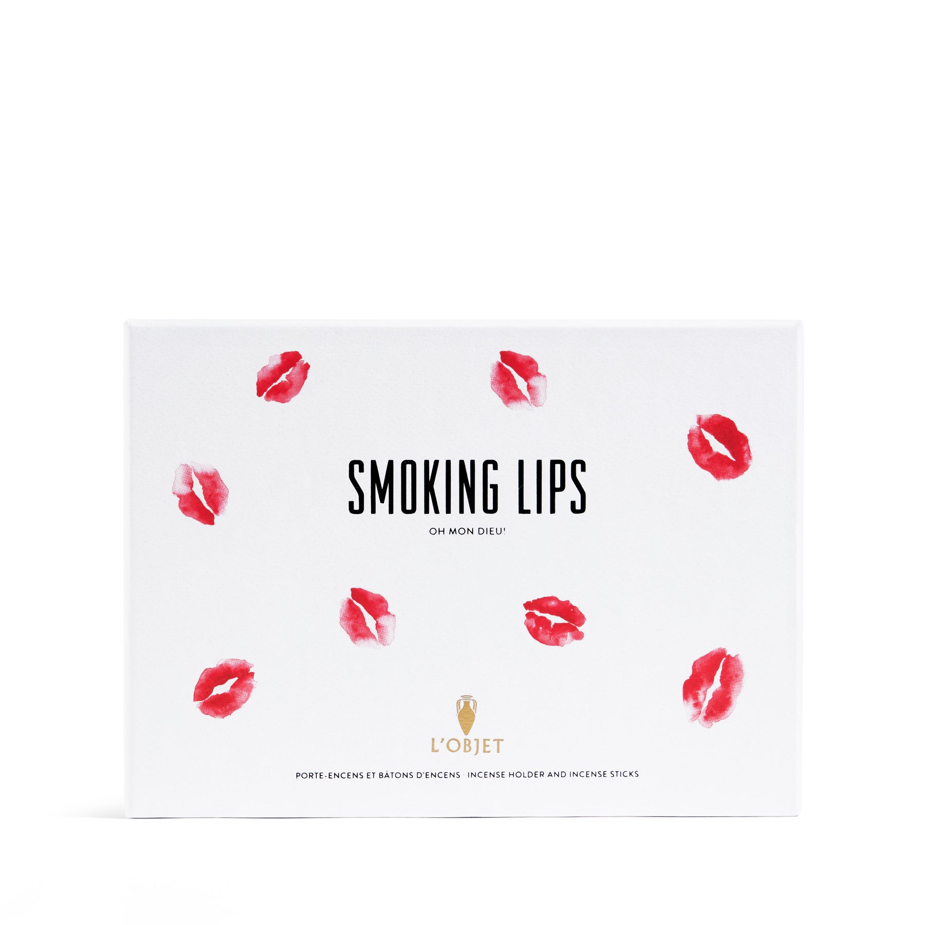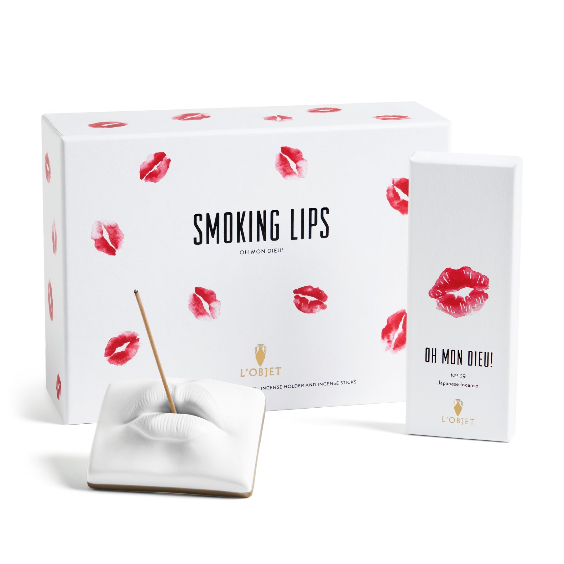 The Smoking Lips Set pairs high-quality Japanese incense with L’OBJET’s iconic porcelain lips incense holder to create a complete sensory ritual. The Oh Mon Dieu! fragrance blends notes of cognac, lipstick, and caramel with gentle hints of incense and leather, inspired by the bold nights of Paris in 1969. The sculpted lips incense holder in fine porcelain adds a striking and elegant touch to any space, making the set both functional and beautifully expressive.