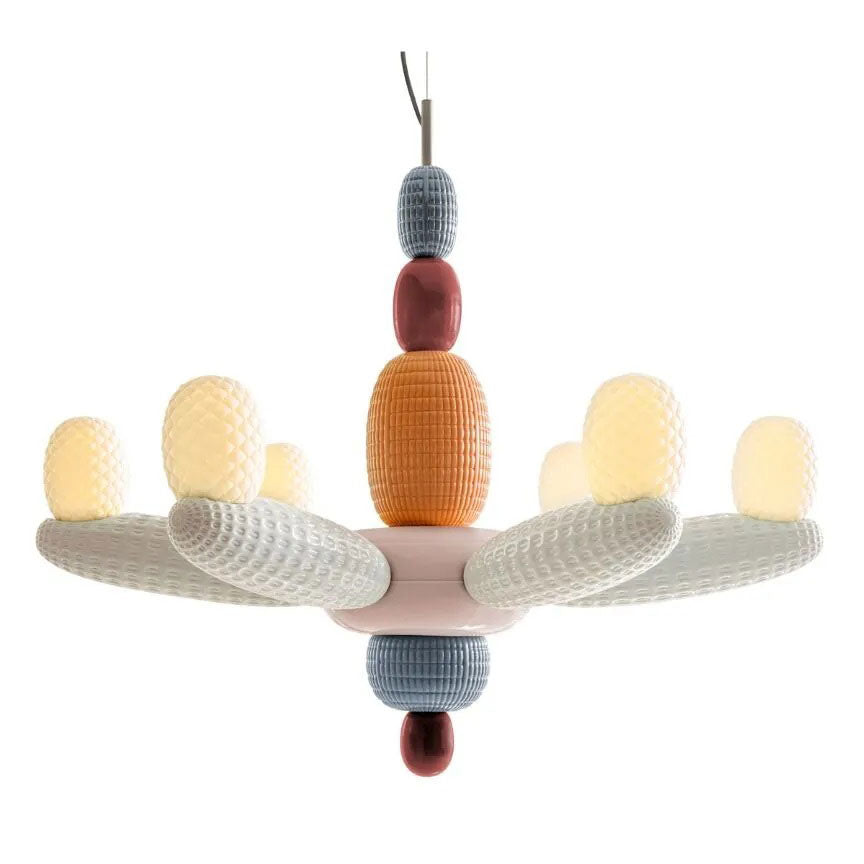 The Soft Blown Chandelier features a unique design inspired by the playful shapes of colorful balloon animals. The chandelier's chunky shapes are crafted from porcelain ceramic with a variety of colors and textures for a fun and festive look.