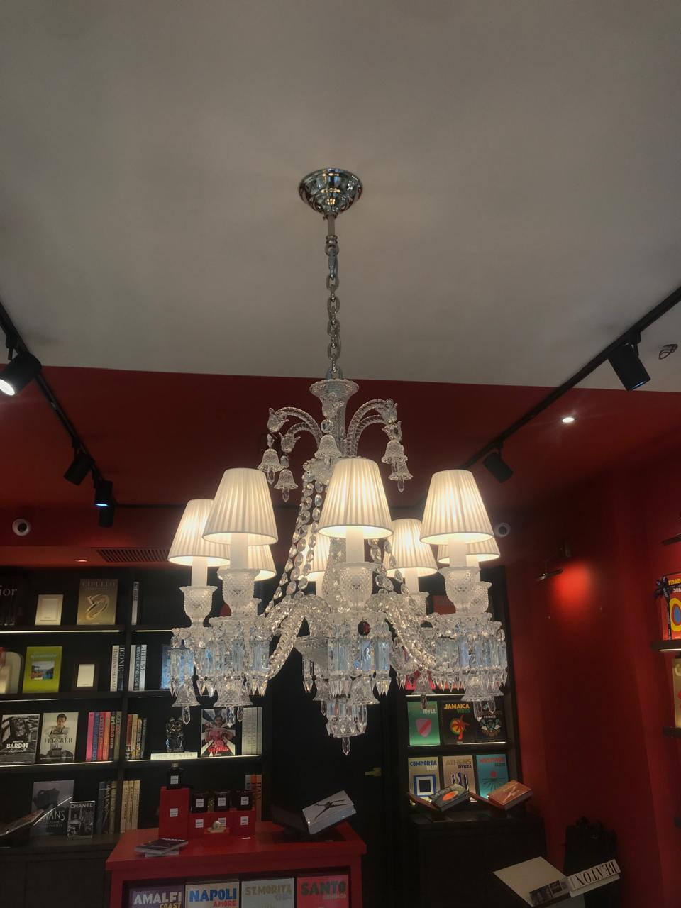 The chandelier is a truly dazzling decorative piece the luminous Clear crystal a revelation sculptural splendor. The composition of this chandelier may range immensely from 6 to 48 lights. Regardless of scale, the chandelier has a central column of cut crystal that resourcefully masks all functional cables. The wealth of ornamentation is enthralling, festooned with chiseled prisms, sparkling pendants, and Baccarat's signature single red octagonal crystal hung discreetly.