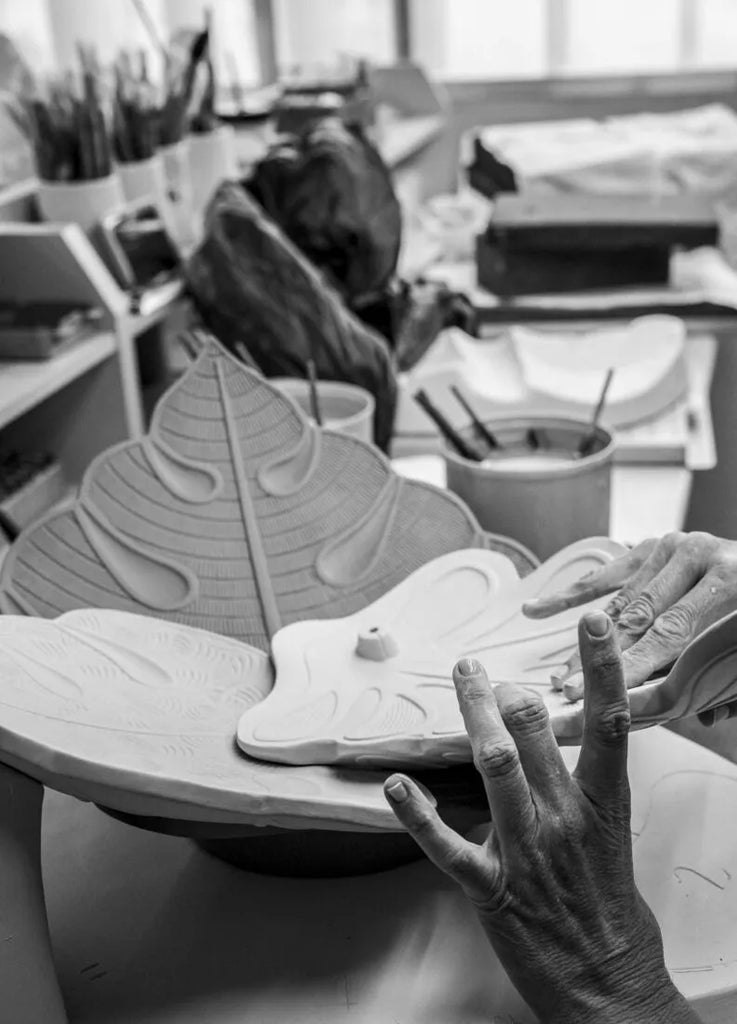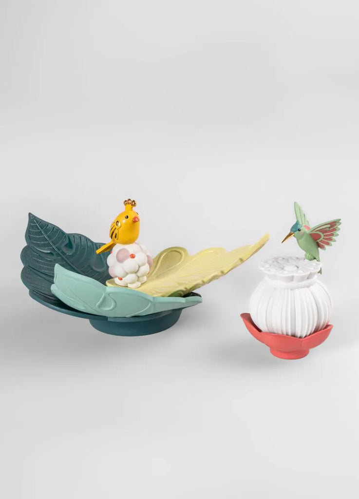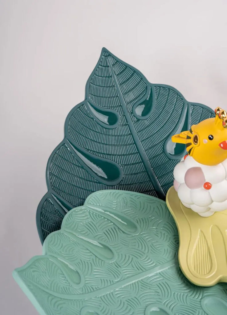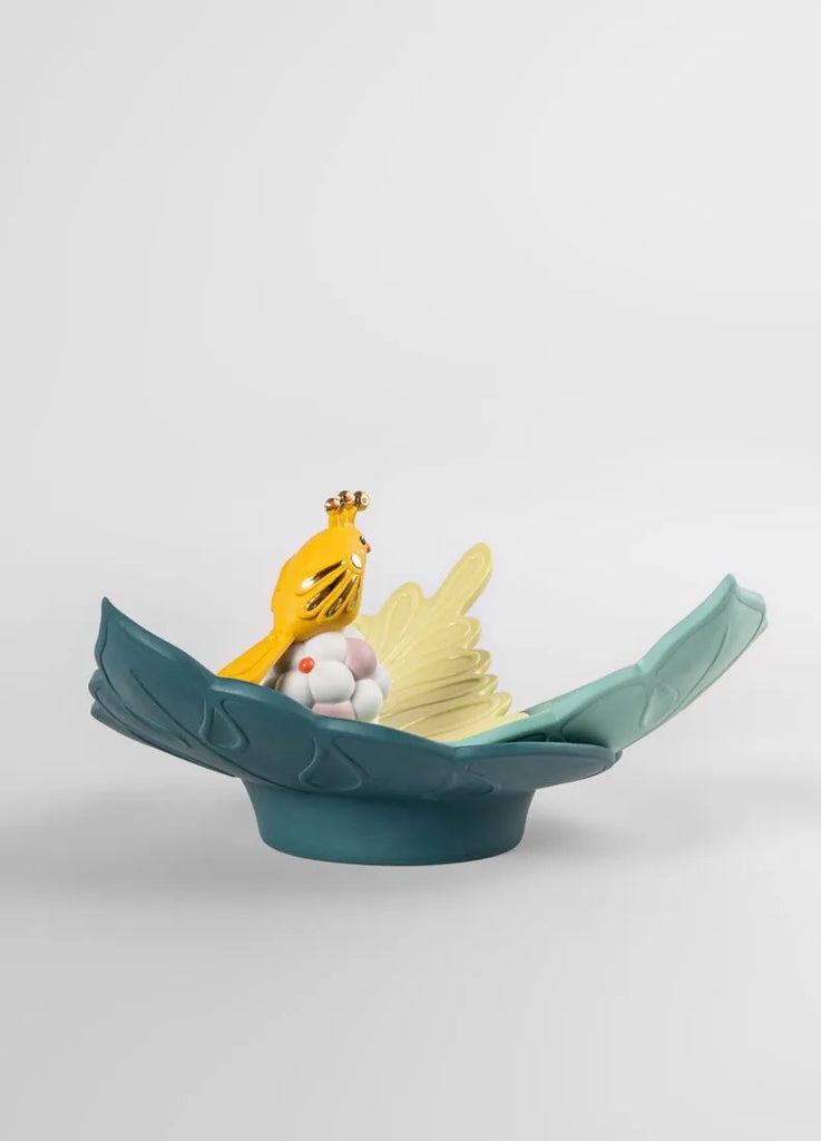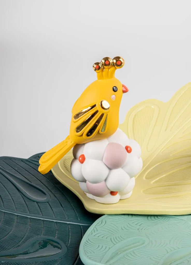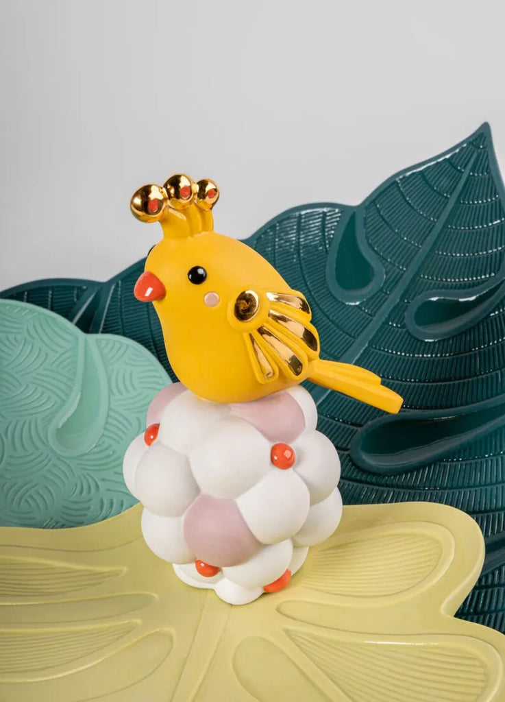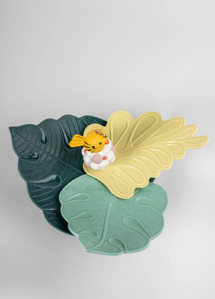 Este centro de mesa de la colección Utopical combina naturaleza y diseño contemporáneo en una pieza funcional y decorativa. Tres grandes hojas de porcelana mate, grabadas a mano, enmarcan a un simpático pájaro que parece surgir entre lo real y lo imaginado, decorado con detalles dorados en sus alas y penacho. El equilibrio entre simplicidad y riqueza en detalles convierte a este centro de mesa en un objeto versátil y original. Una creación que captura la esencia de la naturaleza en su estado más puro.