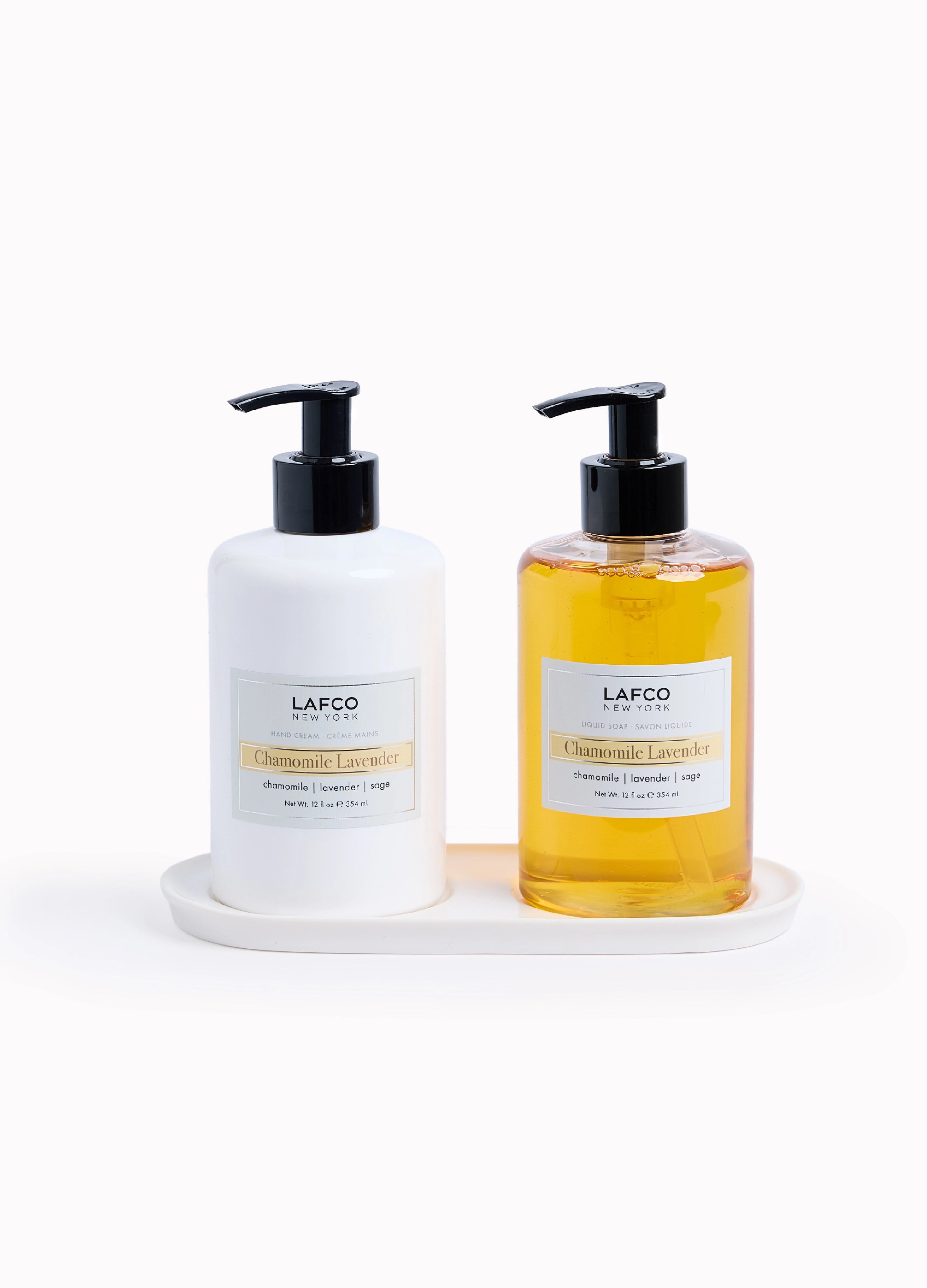 Perfect for the kitchen or bath. Our deluxe hand care set includes a liquid soap, hand cream, and ceramic tray that adds a simple, spa-like touch to any space. Calming chamomile melts into a heart of eucalyptus to create a feeling of well-being. Smoky patchouli is enhanced by hints of sage and rosemary for a quiet, relaxing finish.