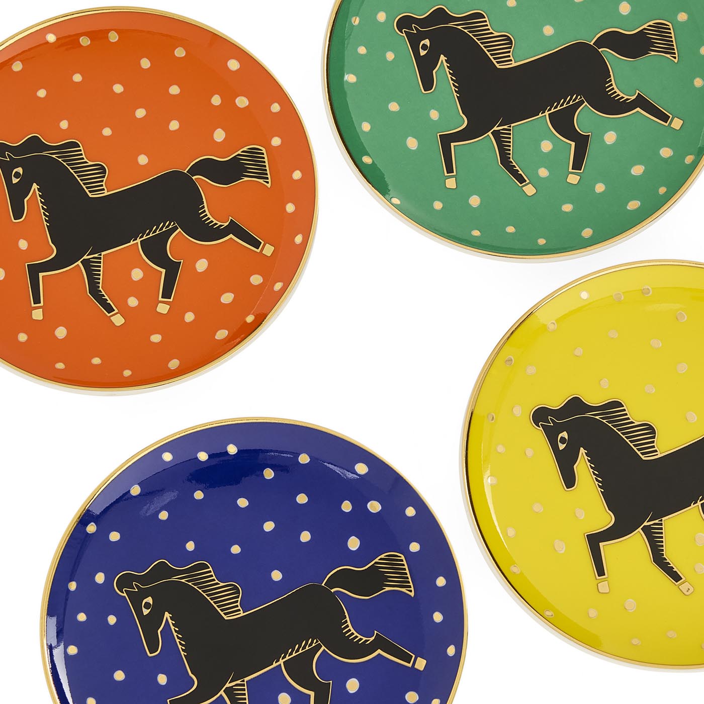 Featuring our signature horse on bold toned backdrops dotted with gold, our Cheval coasters are crafted from high-fired porcelain. Each set is packaged in a nifty gift box, the perfect hostess present (or pick-me-up for yourself).