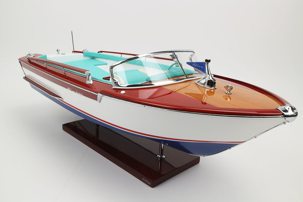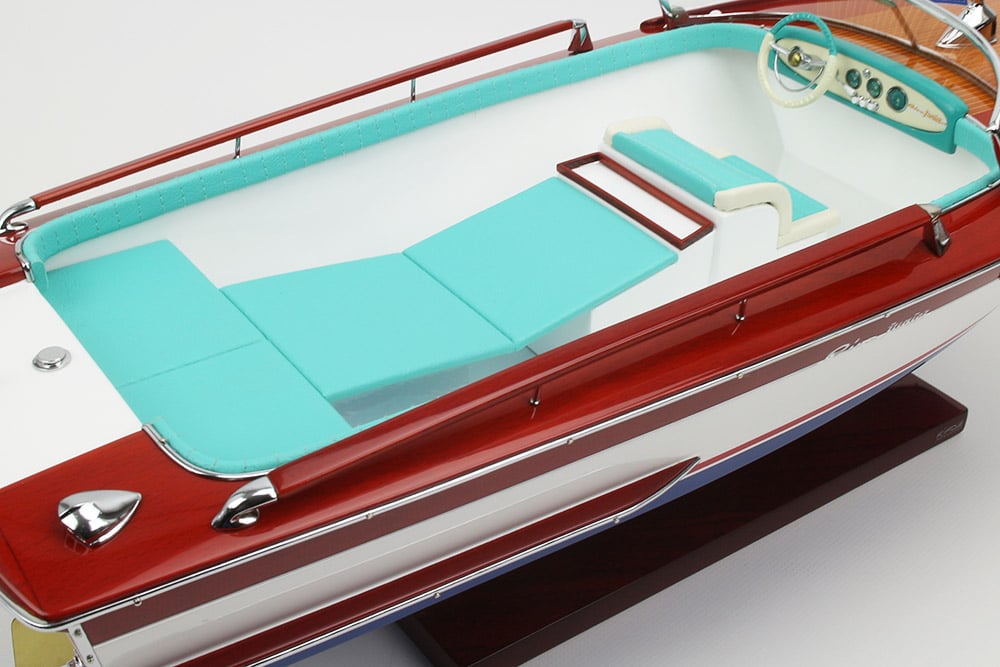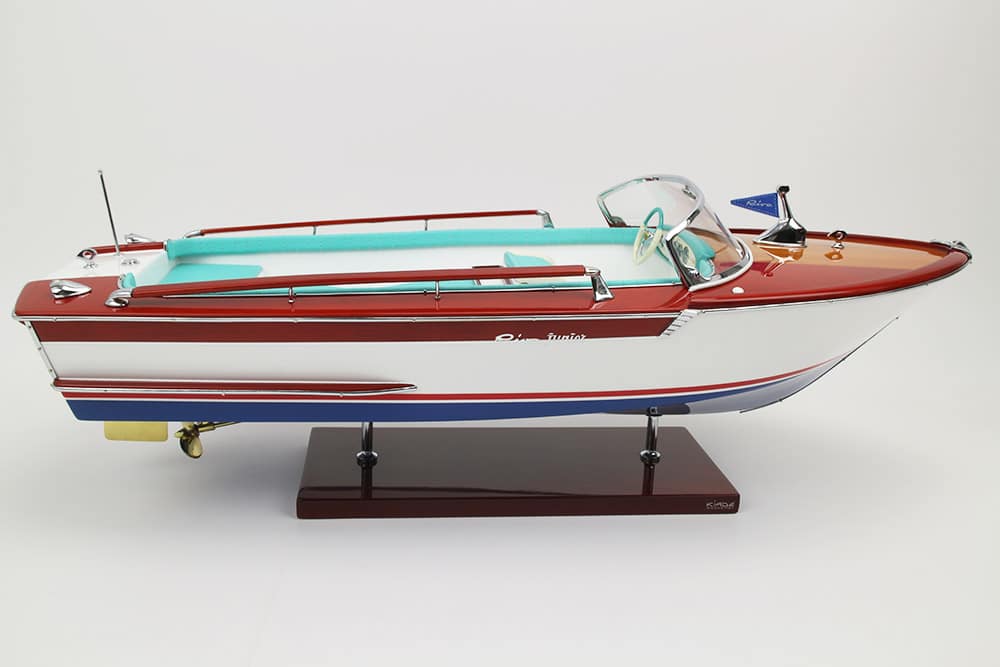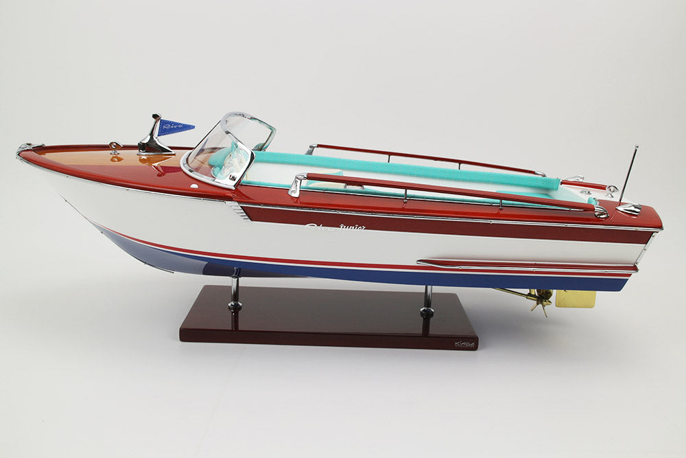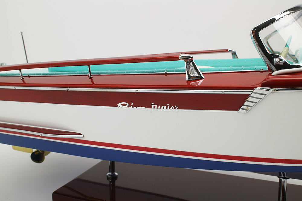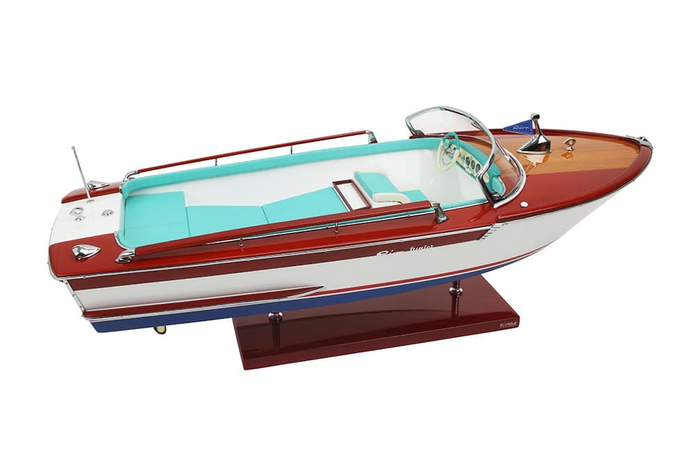 Fiel réplica de la Riva Junior, este exclusivo modelo oficial está totalmente fabricado a mano con los mejores materiales: madera auténtica y auténtica tapicería marina. Todos los herrajes son de latón cromado, fabricados a medida por nuestros joyeros.