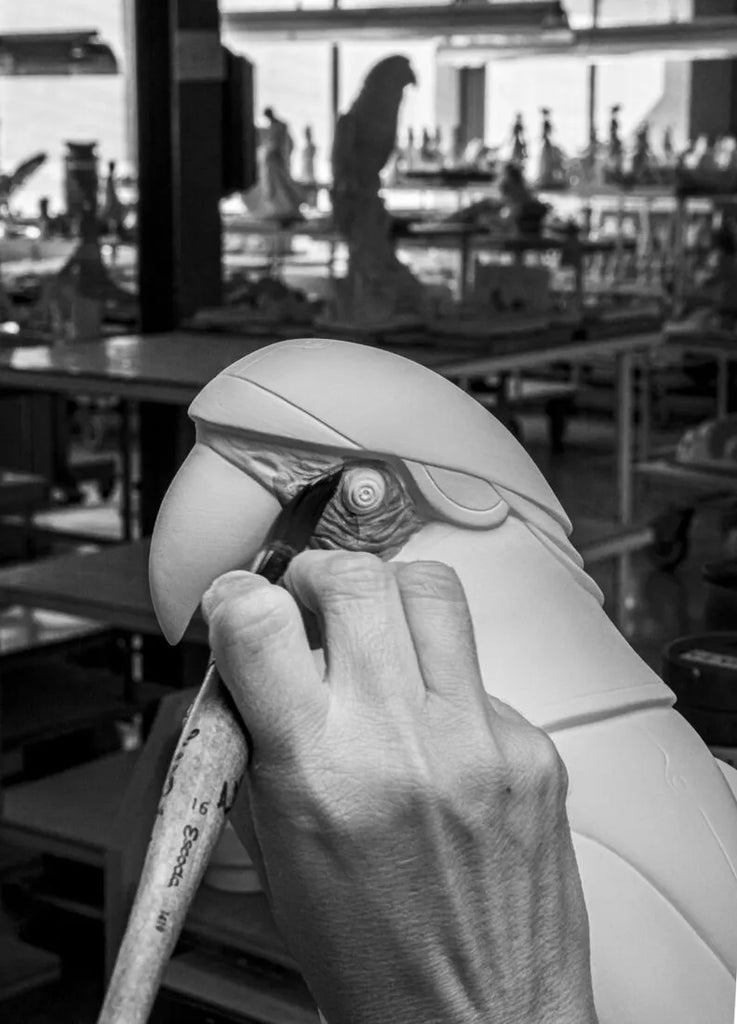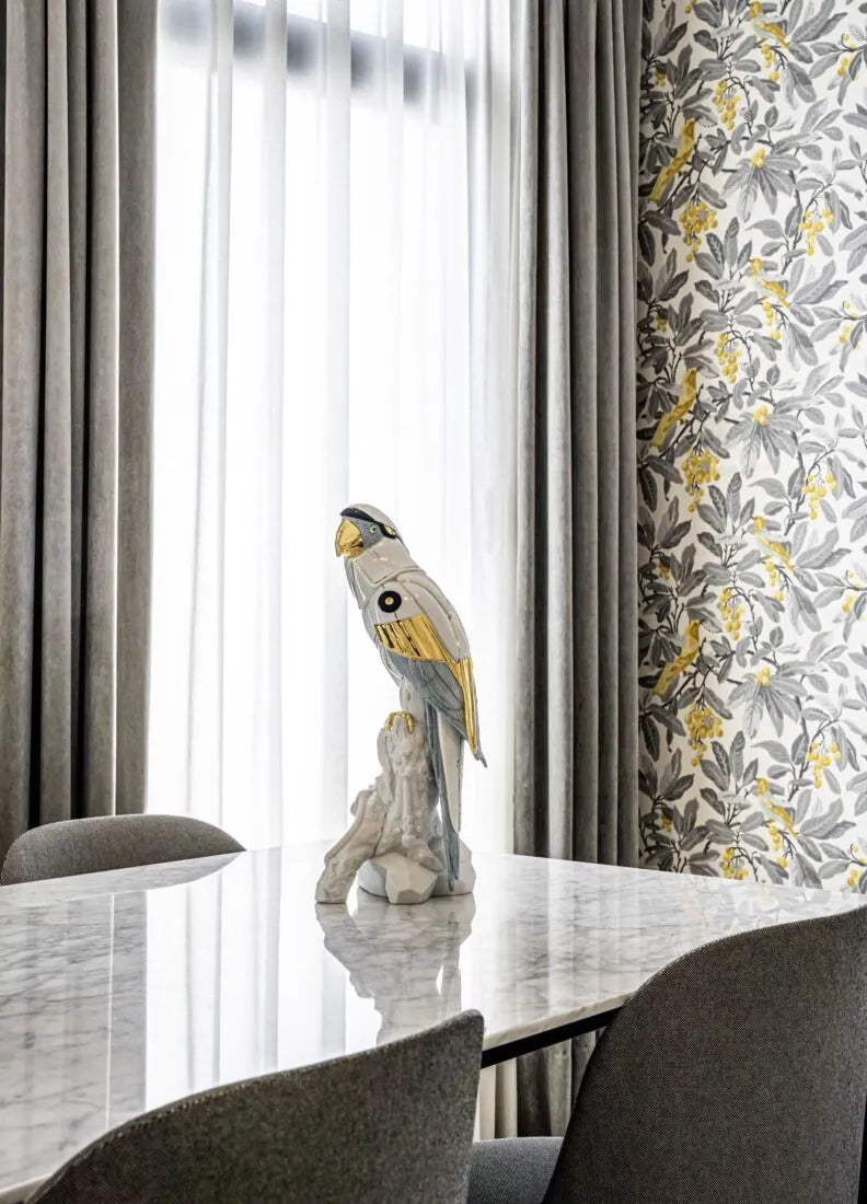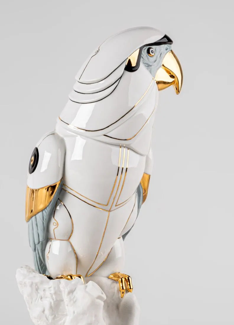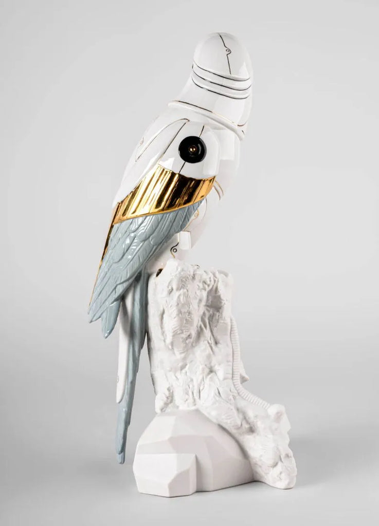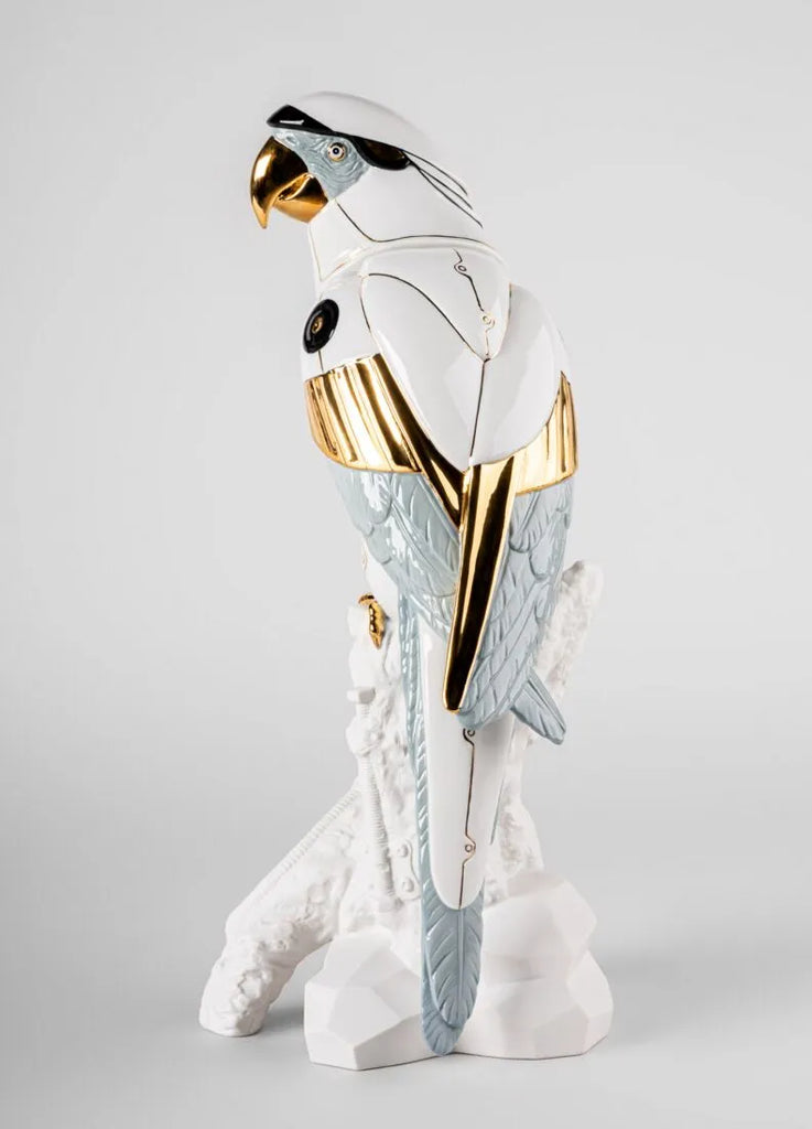 En un mundo acostumbrado a los avances más sorprendentes de la ciencia, el arte sigue componiendo realidades nuevas e inesperadas, como ocurre con Guacamayo Cyborg. Mitad animal, mitad máquina, el cyborg es un producto de la imaginación, de la idea de un mundo en el que los seres vivos y los robots se complementan. Las formas inconfundibles del guacamayo, perfectamente modeladas en porcelana blanca brillo, muestran un nuevo significado gracias a la decoración y al trabajo ornamental. Detalles en lustre dorado, negro y gris azulado realzan la figura, creando un contraste muy llamativo.