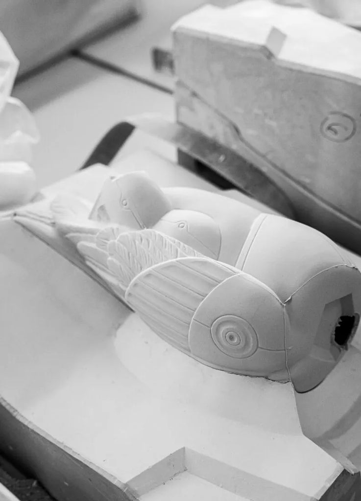 Por otro lado, a las líneas geométricas que delinean la estructura del ave, se suma un detallado trabajo de ornamentación en relieve, que enriquece las partes decoradas en lustre dorado y consigue expresar ese efecto metálico, robótico.