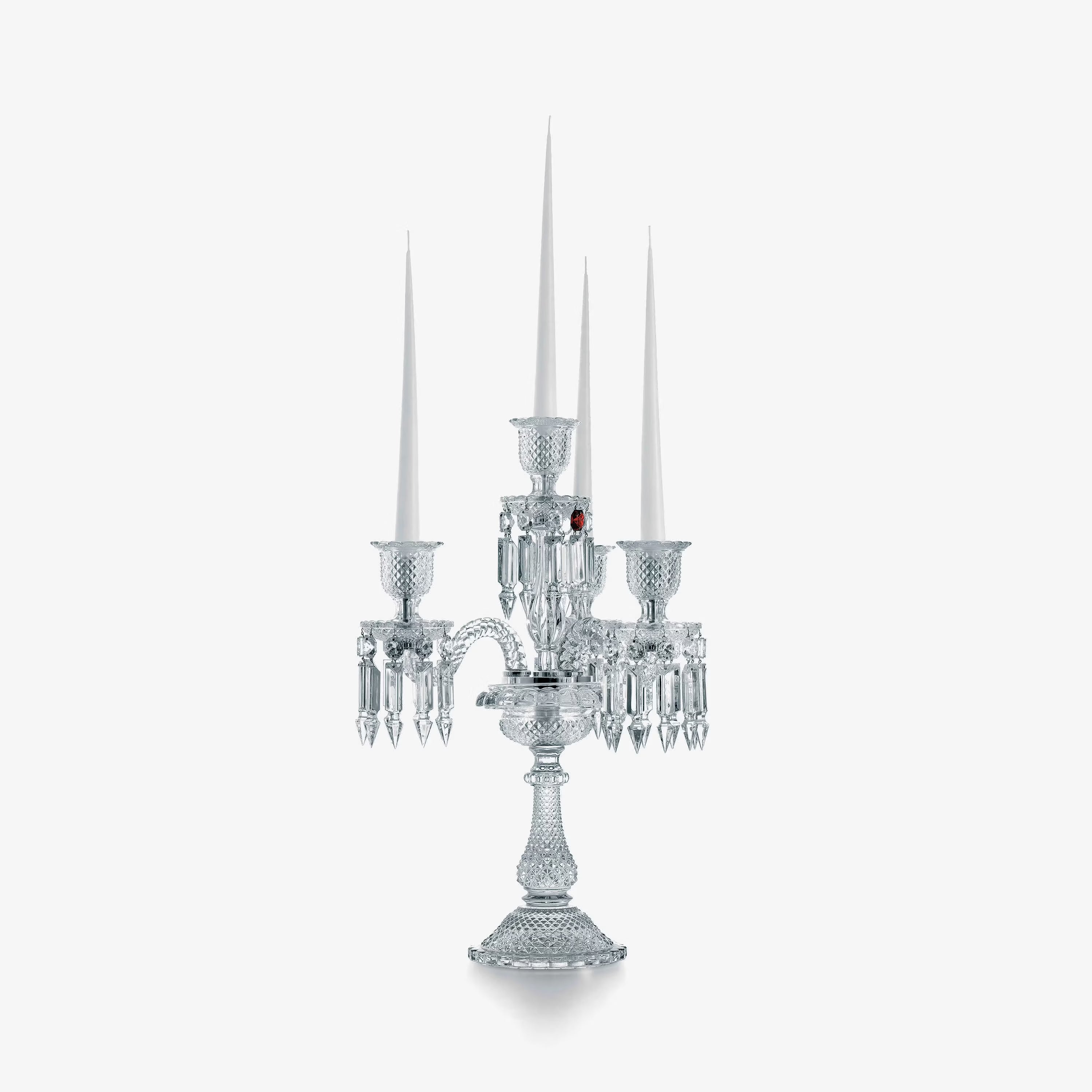 The Zenith collection, created at the end of the 19th century, is one of Baccarat’s most iconic lighting designs. The Zenith candelabra is luminously draped with geometrically cut crystal shapes, amongst which hangs Baccarat’s signature red octagonal crystal discreet yet striking. The lacquered aluminum base provides a solid foundation, which not only protects the crystal from any tremors but also gives the candelabra a hint of modern shine. The Zenith candelabra is available in two models that suit either two or four candles (candles not included with the candelabra). Glass hurricane shades may be added for an even more emphatically glowing effect. Philippe Starck revisited the Zenith collection in onyx crystal, which has proved to be as alluring in black as in Clear crystal.