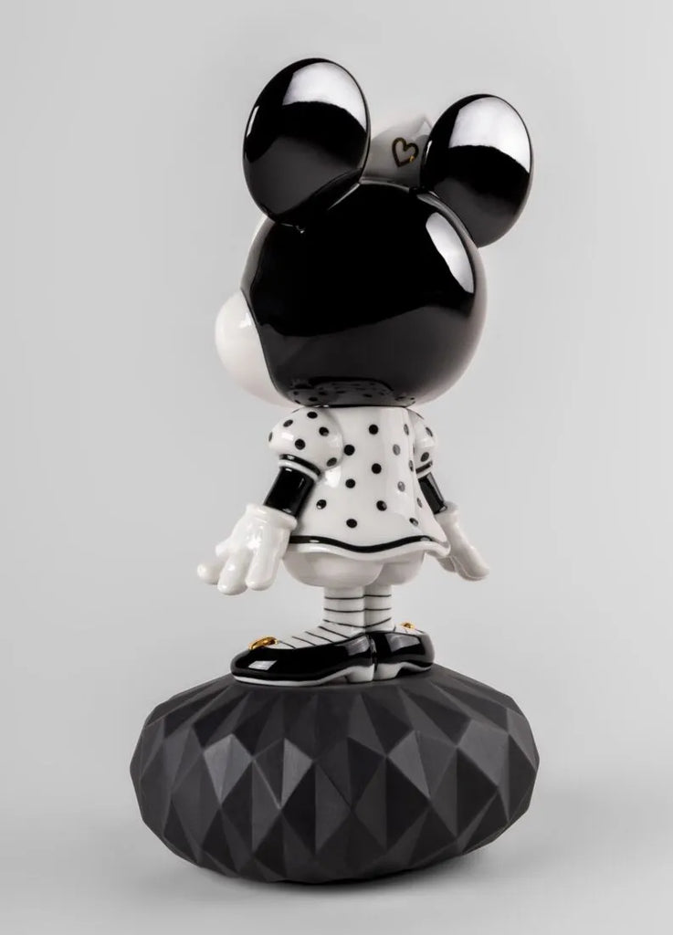 Esta creación parte de una visión contemporánea de Minnie, la gran compañera de Mickey Mouse. Su planteamiento creativo toma de referencia la técnica de los dibujos animados y sus trazos en tinta negra sobre blanco. De este modo, para la decoración de Minnie se ha optado únicamente por el uso del color negro combinado con toques de lustre dorado aplicados en los lazos del cabello y del calzado y en la punta de su nariz. El resultado es una Minnie inconfundible y entrañable que ha cambiado su tradicional vestido rojo por uno blanco con lunares negros aplicados con la máxima precisión. La peana es de porcelana negra facetada.