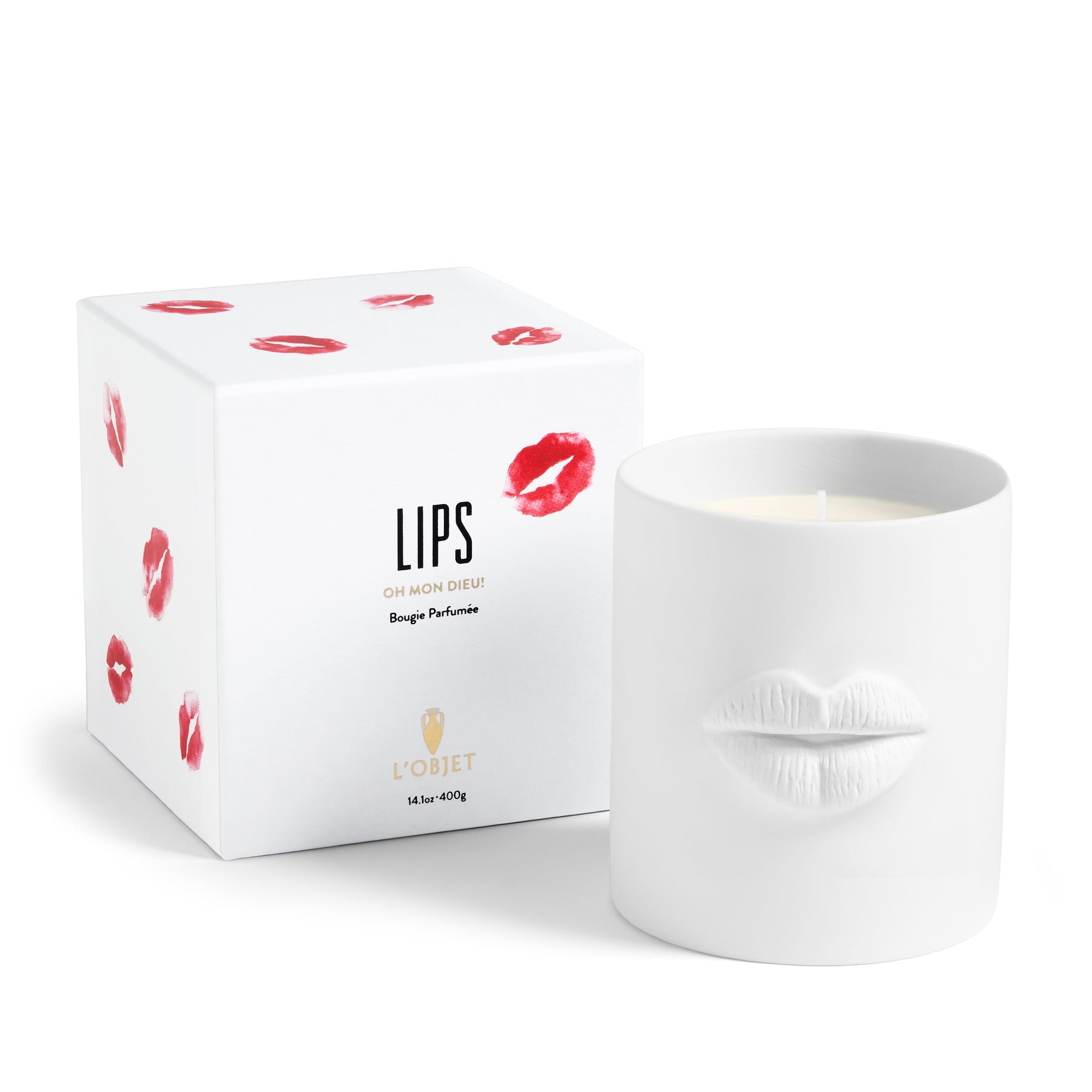The Lips Candle features a fine bisque porcelain vessel adorned with sculpted voluptuous lips. Made of paraffin wax blended with 100% natural oils and essences, the Lips Candle fills the space with notes of cognac and lipstick, softened by hints of incense, leather, and caramel. Once the candle has burned, the vessel transforms into a refined keepsake.