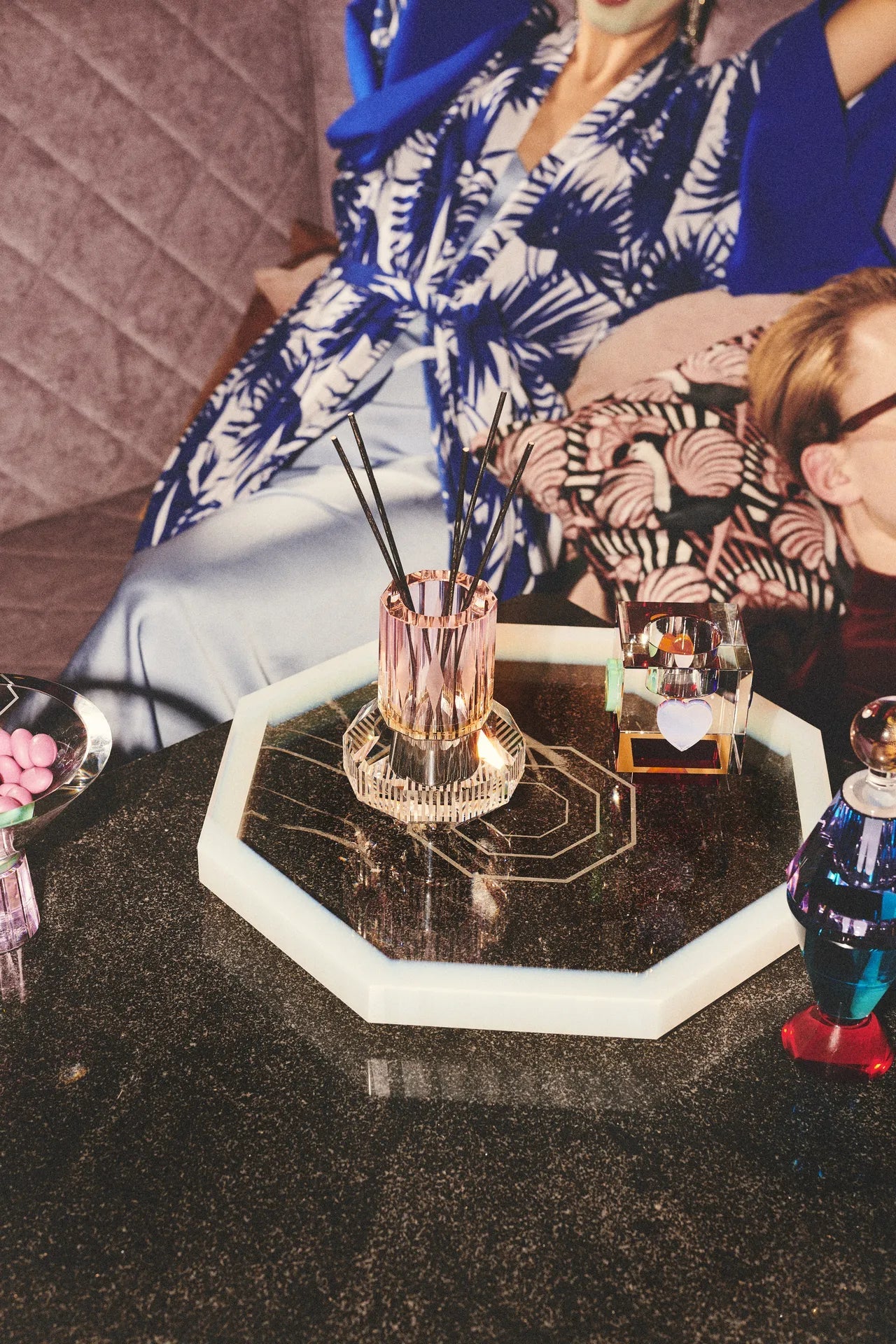 The Chicago diffuser vase and incense sticks will add an extra dimension and appeal to your senses. Enjoy the poetic notes of fig garden and sparkling bergamotte. The vase comes with refill bottle and incense sticks. With its jewel-like composition, this elegant vase will bring a lively arrangement to any setting. Arrange and unite it with other Reflections creations for a vibrant composition and a sparkling finish.