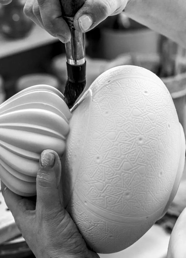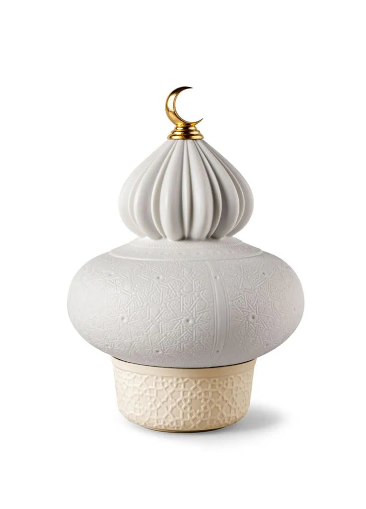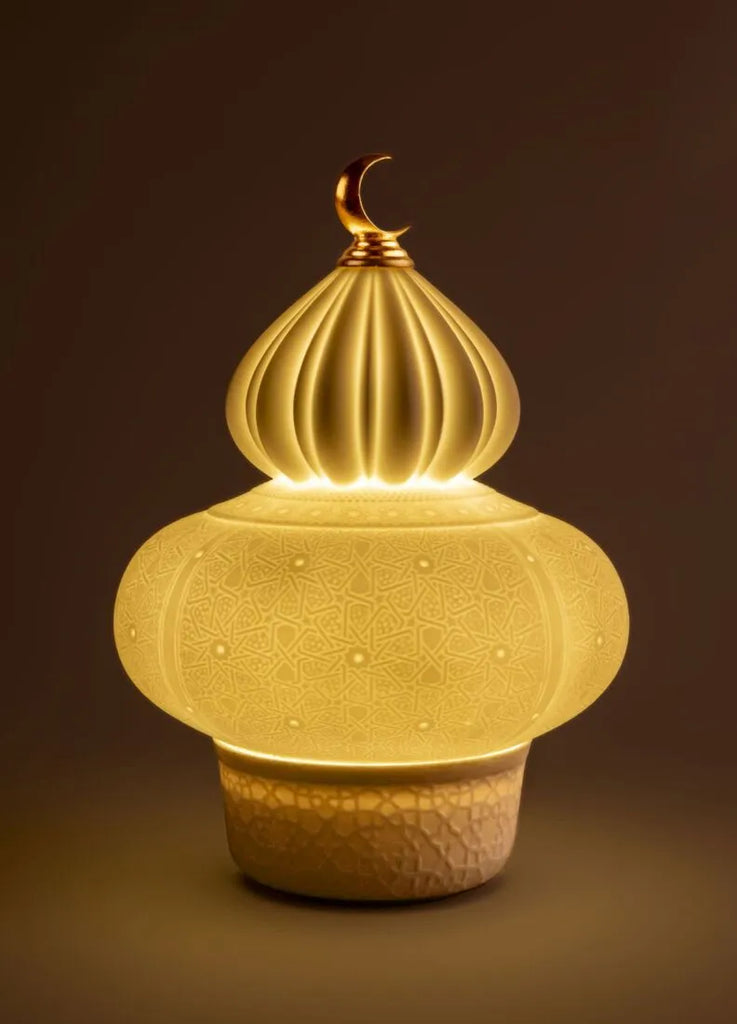 La lámpara inalámbrica Majestic Nights combina la naturalidad de la porcelana con un diseño inspirado en la rica decoración geométrica de las culturas orientales. Su superficie grabada a mano refleja delicados juegos de luces que transforman cualquier rincón en un espacio acogedor y envolvente. Esta pieza, práctica y elegante, invita a soñar y a disfrutar de la serenidad de las mil y una noches. Perfecta para iluminar tus momentos más especiales, combina artesanía meticulosa y tecnología moderna, haciendo de esta lámpara un objeto único y funcional.