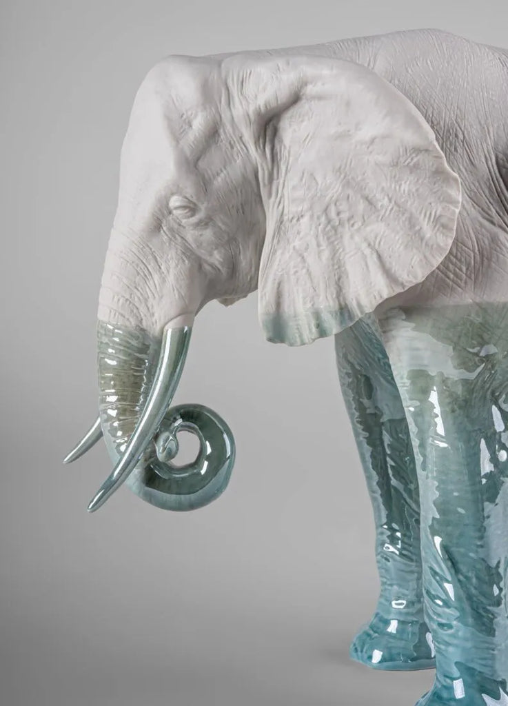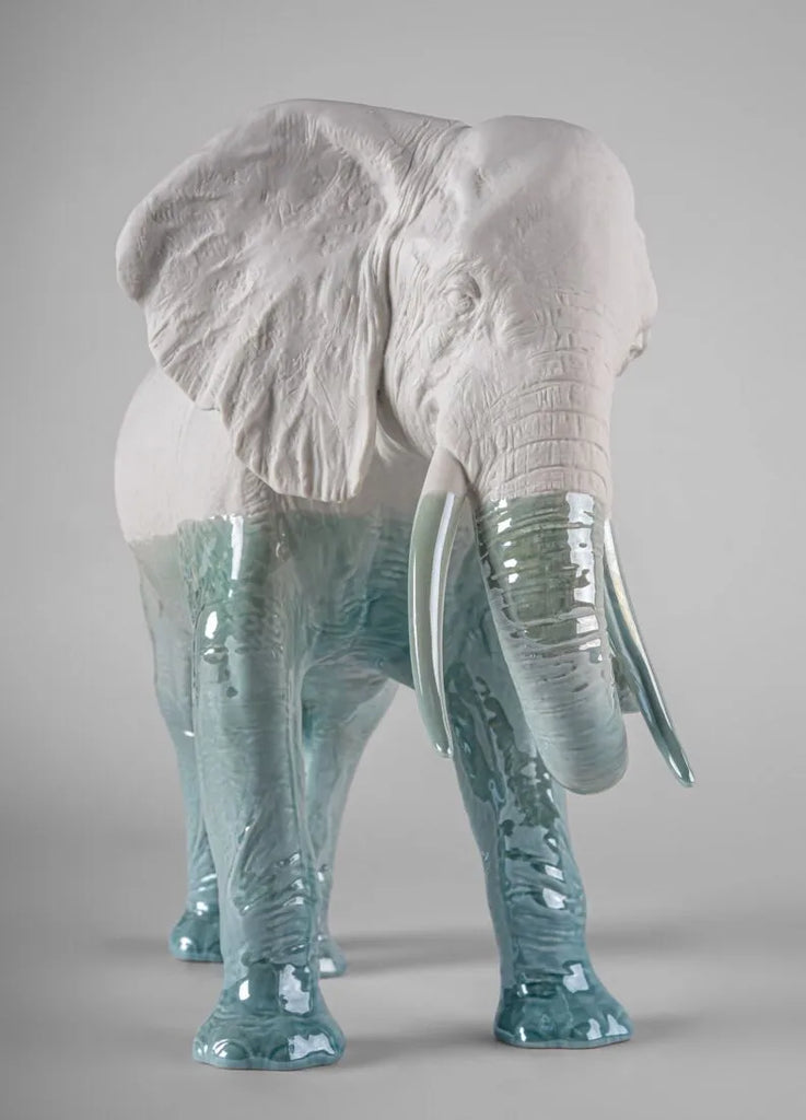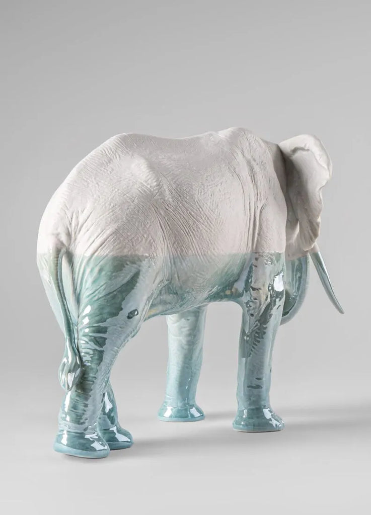Elefante realizado a mano en porcelana, decorado en tonos azulados degradados que consigue un efecto casi real de inmersión en el agua.