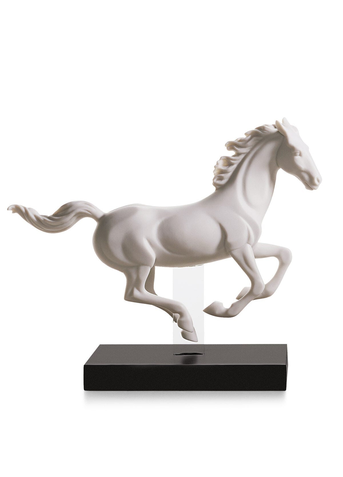 Figura animal de porcelana blanca mate de un caballo al galope sujeto por una base de metacrilato transparente a la peana de madera colour marrón oscuro
