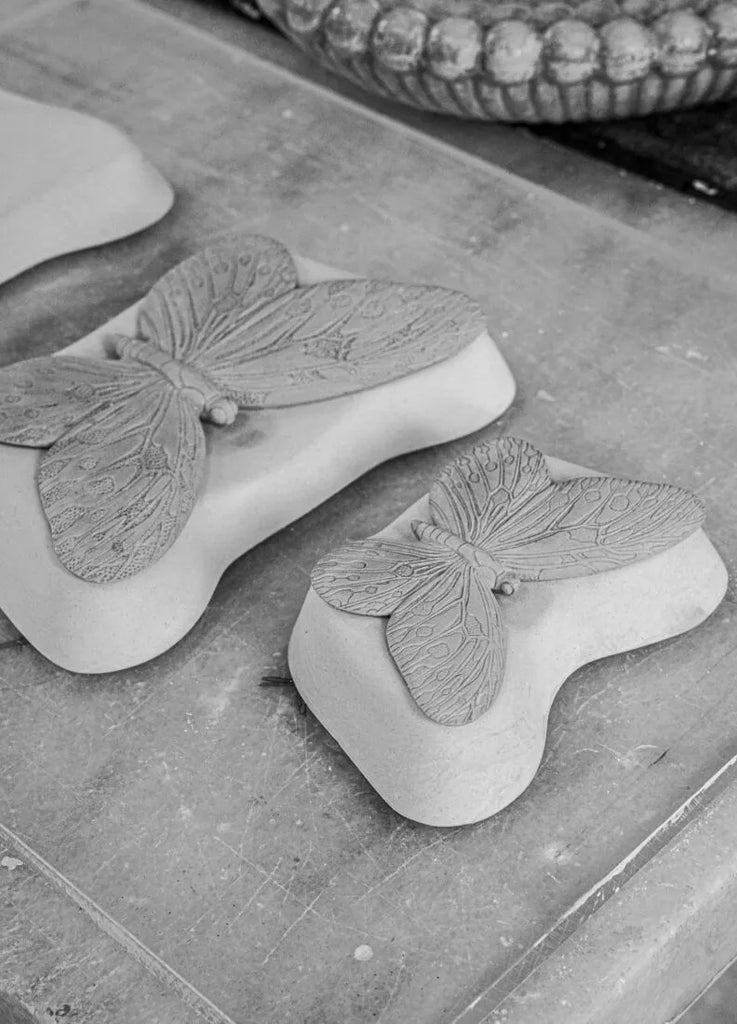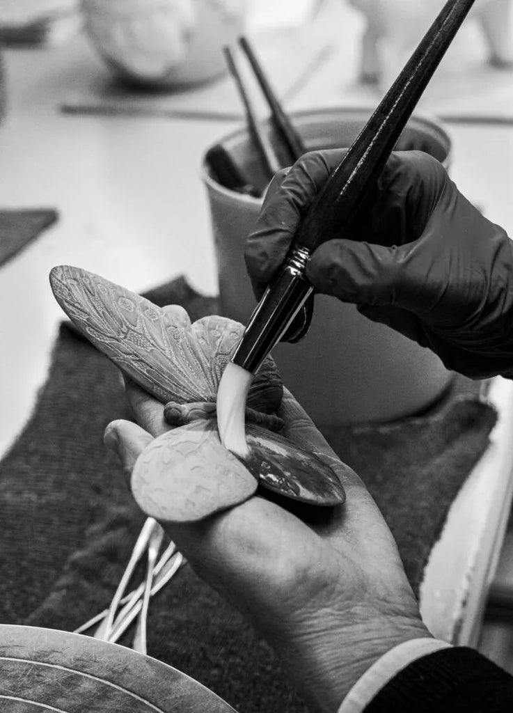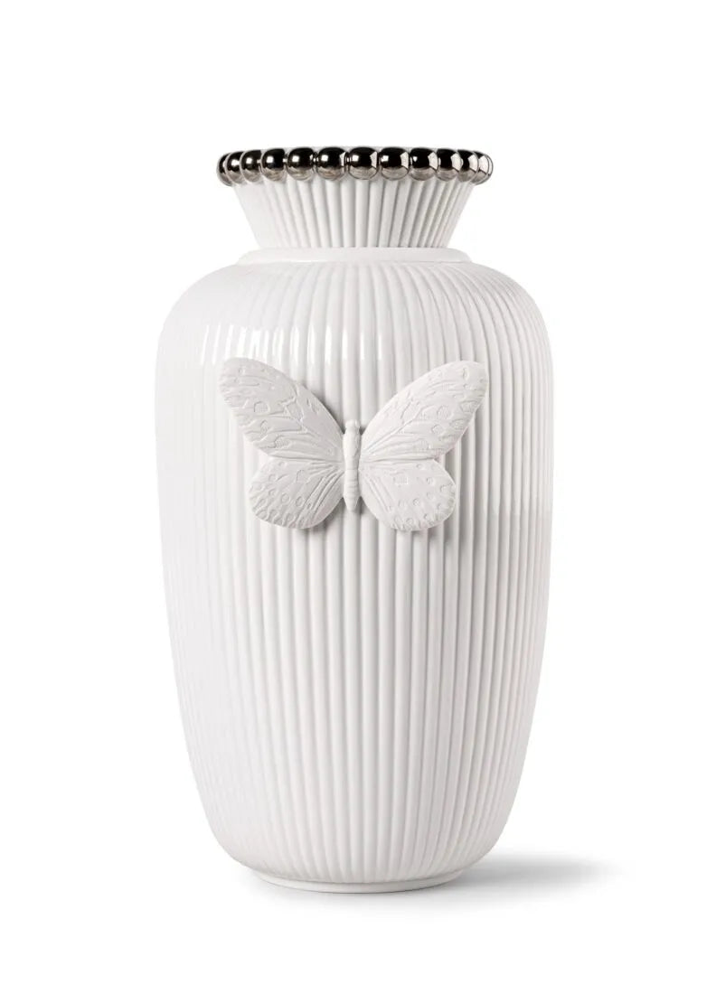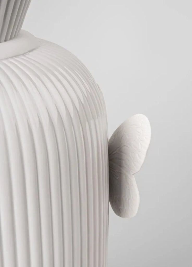El jarrón Lady Luck, parte de la colección diseñada por Olga Hanono, transforma la porcelana en un objeto artístico de extraordinaria belleza. Su forma ondulada, elaborada en porcelana blanca mate, se complementa con una mariposa pintada a mano, símbolo de transformación y buena fortuna.