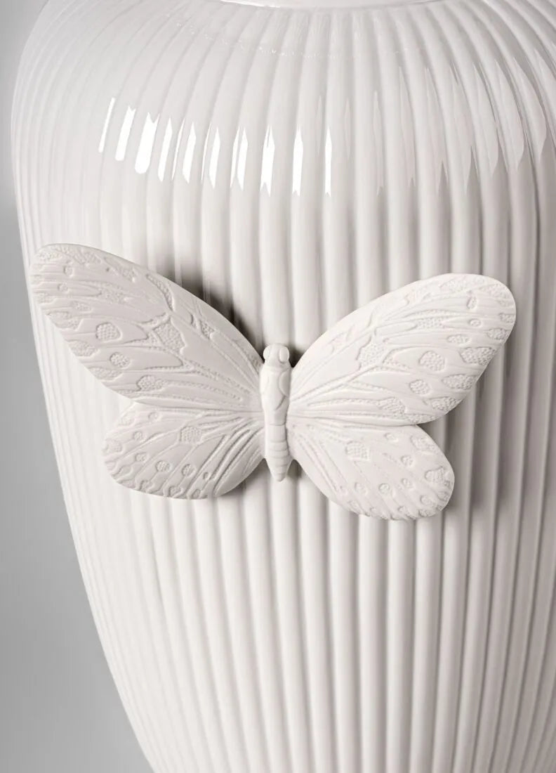Jarrón de porcelana blanca mate con diseño ondulado y mariposa pintada a mano, un símbolo de buena suerte y elegancia.