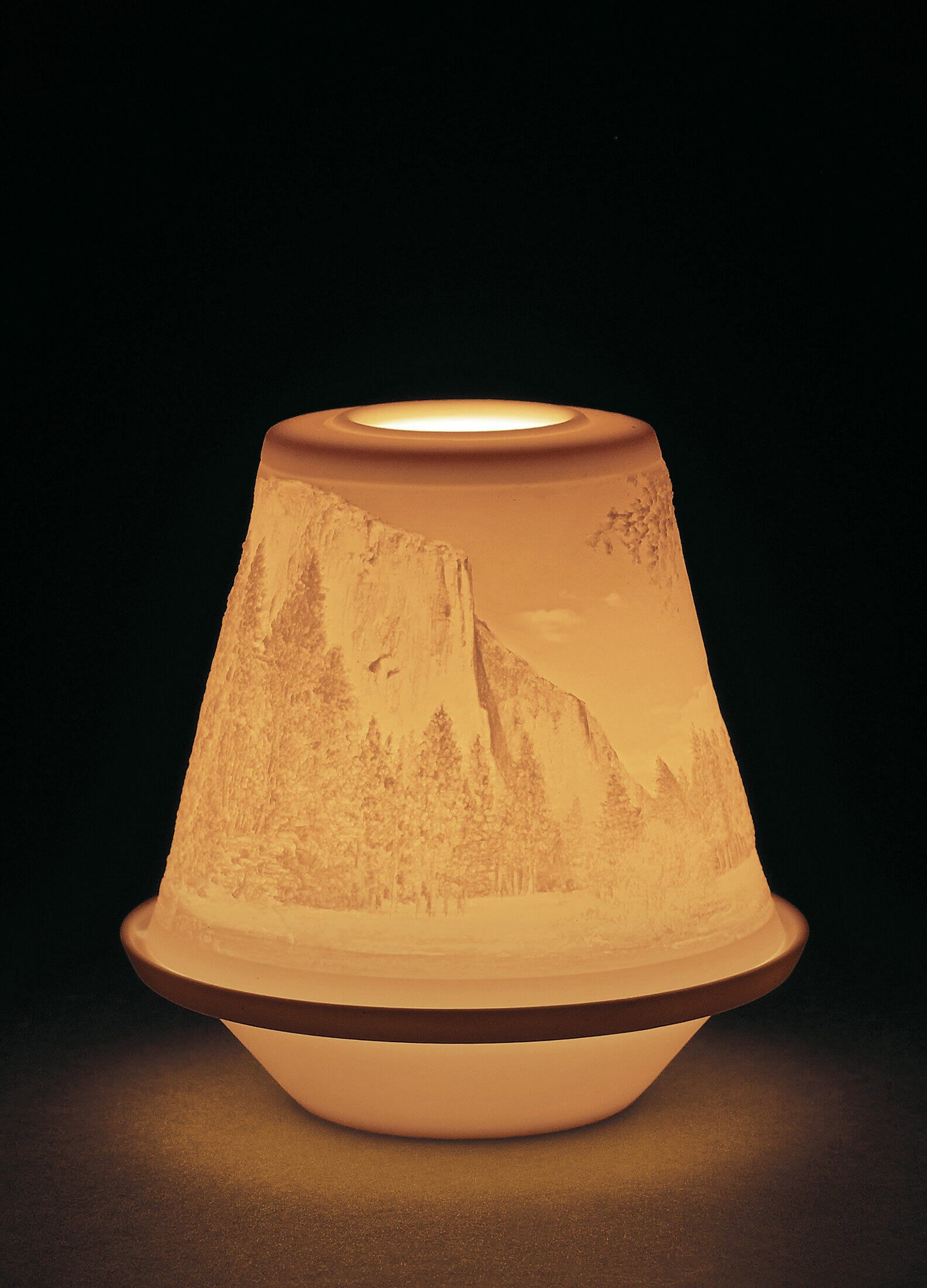La magia de la litofanía nace del juego de la luz con el carácter translucido de la porcelana. Al iluminar su interior, proyecta una cálida iluminación a toda la estancia y resalta el grabado que la decoran produciendo sorprendentes efectos de relieve en su superficie. Esta pieza nos muestra un precioso paisaje de montaña que nos traslada a espacios abiertos llenos de frescor y aire puro. Perfecta para regalar y para los amantes de la naturaleza.